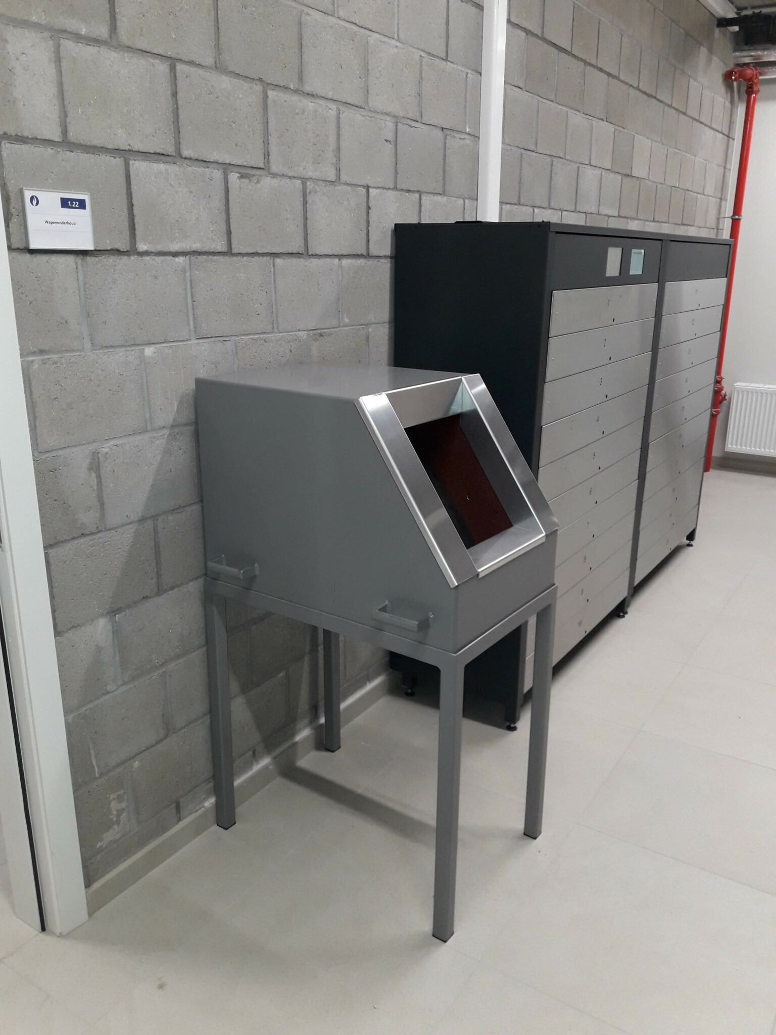 These tubes are made of S235 steel sheets. The inside of the tube is filled with rubber granulates to slow down the bullets. A narrow opening is provided on the upper part of the tube in order to insert the weapon. This opening is composed of anti-ricochet tiles and ensures that the gun barrel is inserted parallel to the tube in order to reduce the impact angle in case of firing.